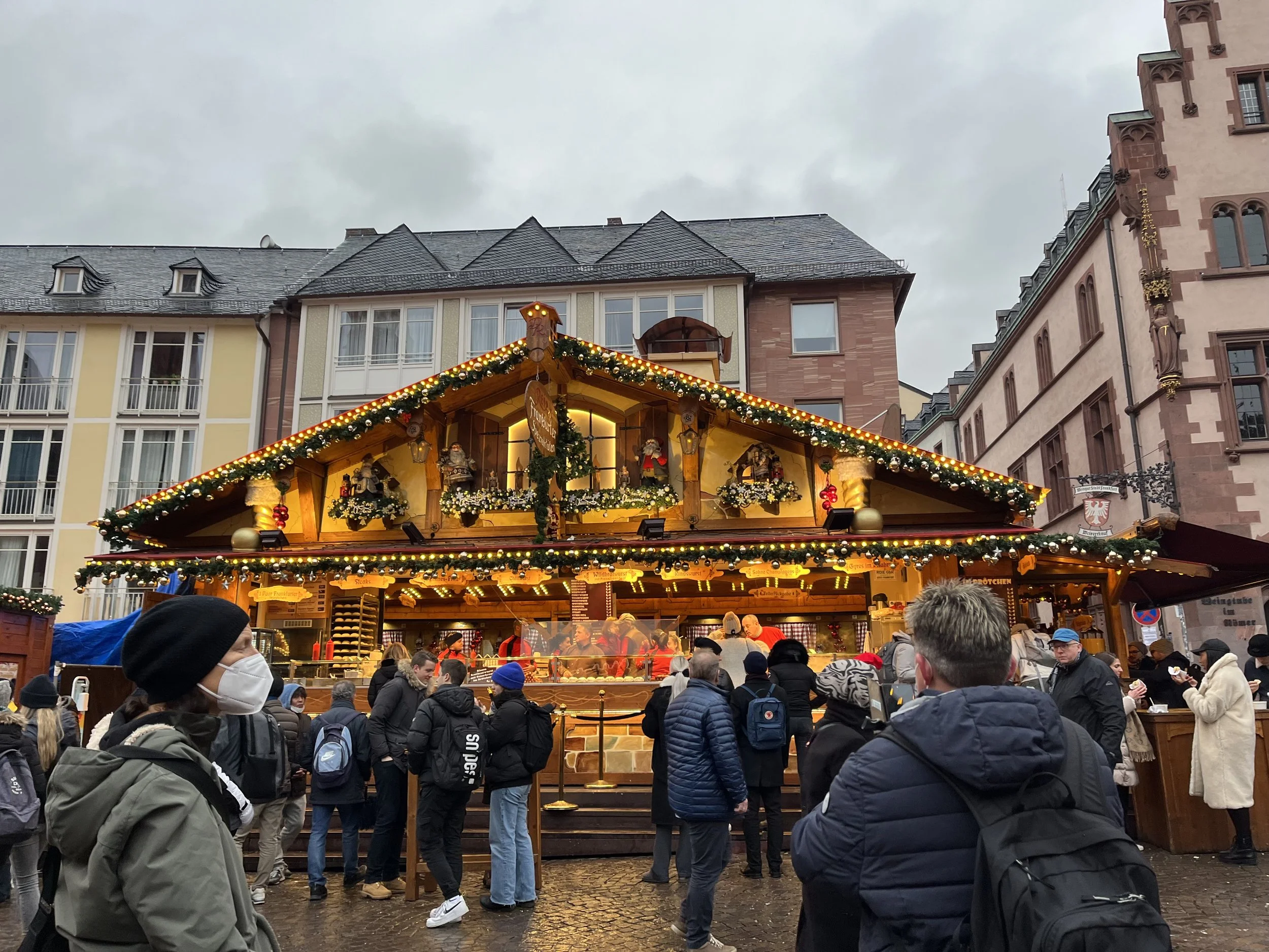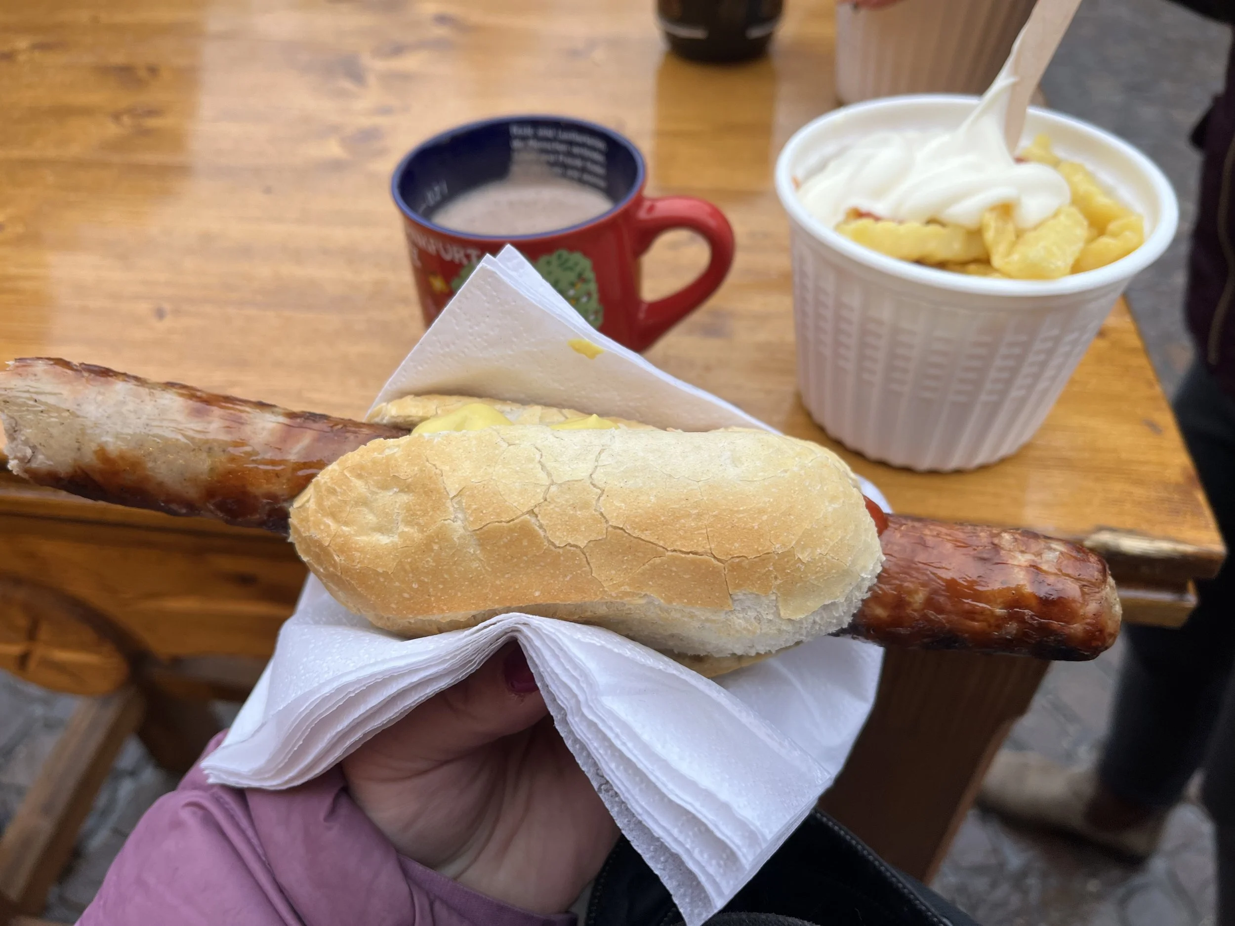 After sleeping in this morning, Lynne and Leona made their way back to Frankfurt’s old town to enjoy more of the market. The public transit system in Frankfurt is well laid out and with the help of maps they found their way quickly. Frankfurt is an industrious city, with most notable tourist attractions being the Old Town and Christmas Market. For lunch, Lynne enjoyed standard local fare- bratwurst and Pommes Frites for about 10 euro.